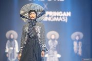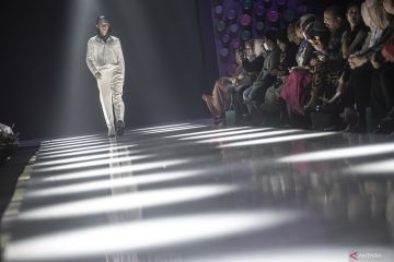 Model memperagakan busana dari Opie Ovie X Batik Papringan (Kub Pringmas) dalam perhelatan MUFFEST+ 2023 Road To IN2MOTIONFEST (Indonesia International Modest Fashion Festival) di Jakarta, Selasa (7/3/2023). Muslim Fashion Festival (MUFFEST+) 2023 tersebut diikuti lebih dari 200 desainer dan berlangsung mulai 7-10 Maret 2023. ANTARA FOTO/Aprillio Akbar/foc.