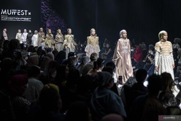 Model memperagakan busana dari Bandid Lasavong dalam perhelatan MUFFEST+ 2023 Road To IN2MOTIONFEST (Indonesia International Modest Fashion Festival) di Jakarta, Selasa (7/3/2023). Muslim Fashion Festival (MUFFEST+) 2023 tersebut diikuti lebih dari 200 desainer dan berlangsung mulai 7-10 Maret 2023. ANTARA FOTO/Aprillio Akbar/foc.