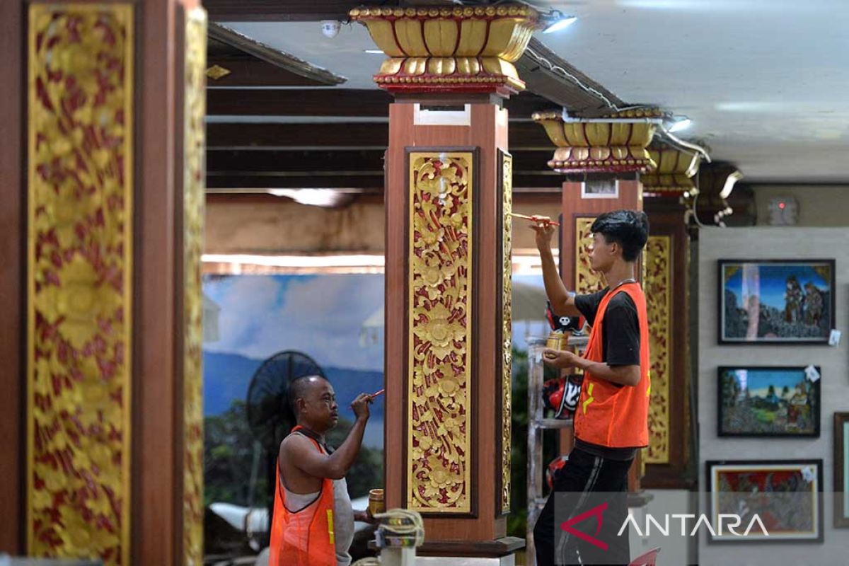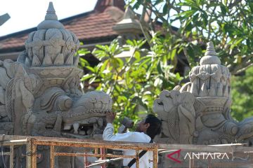 Pekerja mengukir patung saat pengerjaan renovasi Gedung Ksirarnawa yang terletak di dalam kawasan Taman Budaya Bali, Denpasar, Bali, Sabtu (11/3/2023). Sejumlah renovasi dan penataan dilakukan di kawasan Taman Budaya Bali khususnya di Gedung Ksirarnawa yang akan menjadi lokasi pengundian (drawing) grup Piala Dunia U-20 2023 pada 31 Maret mendatang. ANTARA FOTO/Fikri Yusuf/nym.