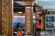 Pekerja menyelesaikan pengerjaan renovasi Gedung Ksirarnawa yang terletak di dalam kawasan Taman Budaya Bali, Denpasar, Bali, Sabtu (11/3/2023). Sejumlah renovasi dan penataan dilakukan di kawasan Taman Budaya Bali khususnya di Gedung Ksirarnawa yang akan menjadi lokasi pengundian (drawing) grup Piala Dunia U-20 2023 pada 31 Maret mendatang. ANTARA FOTO/Fikri Yusuf/nym.