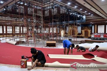 Pekerja memasang karpet di Gedung Ksirarnawa yang terletak di dalam kawasan Taman Budaya Bali, Denpasar, Bali, Sabtu (11/3/2023). Sejumlah renovasi dan penataan dilakukan di kawasan Taman Budaya Bali khususnya di Gedung Ksirarnawa yang akan menjadi lokasi pengundian (drawing) grup Piala Dunia U-20 2023 pada 31 Maret mendatang. ANTARA FOTO/Fikri Yusuf/nym.