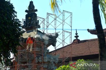 Pekerja mengecat pilar Gedung Ksirarnawa yang terletak di dalam kawasan Taman Budaya Bali, Denpasar, Bali, Sabtu (11/3/2023). Sejumlah renovasi dan penataan dilakukan di kawasan Taman Budaya Bali khususnya di Gedung Ksirarnawa yang akan menjadi lokasi pengundian (drawing) grup Piala Dunia U-20 2023 pada 31 Maret mendatang. ANTARA FOTO/Fikri Yusuf/nym.
