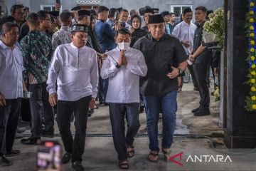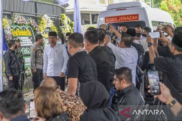 Presiden Joko Widodo tiba di rumah duka untuk melayat almarhum istri Kepala Staf Presiden Moeldoko, Koesni Harningsih di Jalan Terusan Lembang Nomor D54, Menteng, Jakarta, Minggu (12/3/2023). Koesni Harningsih meninggal dunia di usia 63 tahun setelah menjalani perawatan di ICCU RSPAD Kartika Gatot Subroto dan rencananya akan dimakamkan di Taman Makam Pahlawan Bahagia, Tangerang Selatan. ANTARA FOTO/Galih Pradipta/tom.