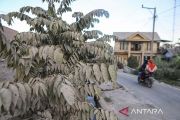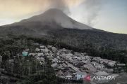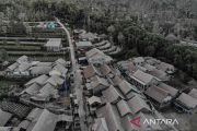 Foto udara hujan abu vulkanis yang turun Dusun Trono, Krinjing, Dukun, Magelang, Jawa Tengah, Senin (13/3/2023). Awan panas guguran Gunung Merapi mengakibatkan hujan abu vulkanis di desa yang terletak di sisi barat Gunung Merapi itu. ANTARA FOTO/Hendra Nurdiyansyah/nym.