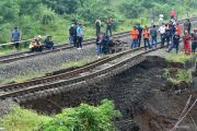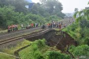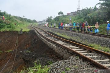 Sejumlah warga dan petugas melihat kondisi tanah longsor di jalur rel Kereta Api (KA) Pangrango lintas Bogor-Sukabumi di Kelurahan Empang, Kota Bogor, Jawa Barat, Rabu (15/3/2023). Tanah longsor yang disebabkan curah hujan yang tinggi di wilayah Kota Bogor pada Selasa (14/3/) malam itu mengakibatkan jalur rel kereta api sepanjang 25 meter menggantung sehingga seluruh perjalanan KA Pangrango lintas Bogor-Sukabumi (PP) dibatalkan. ANTARA FOTO/Arif Firmansyah/hp.