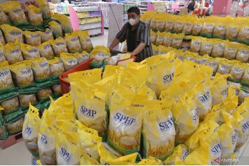Pembeli melintas di samping beras Stabilisasi Pasokan dan Harga Pangan (SPHP) di Cempaka Putih, Jakarta, Rabu (15/3/2023). Perum Bulog memperluas jangkauan distribusi beras ke ritel modern untuk memastikan kebutuhan beras di masyarakat terpenuhi, terjangkau dan mudah didapat. ANTARA FOTO/Fakhri Hermansyah/hp.