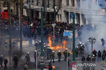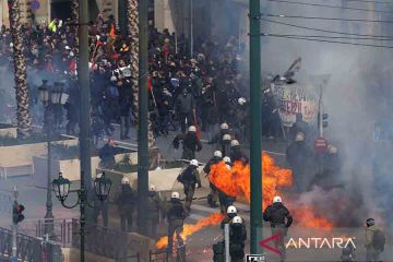 Pengunjuk rasa bentrok dengan kepolisian saat aksi mogok nasional di Anthena, Yunani, Kamis (16/3/2023). Aksi mogok kerja tersebut merupakan buntut dari kecelakaan kereta pada 28 Februari lalu yang menewaskan sebanyak 57 orang. ANTARA FOTO/REUTERS/Alkis Konstantinidis/rwa.