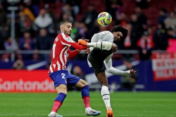 Pesepak bola Atletico Madrid Yannick Carrasco (atas) berebut bola dengan pesepak bola Valencia Eray Comert dalam laga lanjutan Liga Spanyol, di Stadion Metropolitano, Madrid, Spanyol, Sabtu (18/3/2023). Atletico Madrid berhasil mengalahkan Valencia 3-0. ANTARA FOTO/Reuters-Isabel Infantes/hp.