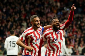 Pesepak bola Atletico Madrid Thomas Lemar (kanan) bersama rekannya Koke (kiri) melakukan selebrasi setelah mencetak gol ke gawang Valencia dalam laga lanjutan Liga Spanyol, di Stadion Metropolitano, Madrid, Spanyol, Sabtu (18/3/2023). Atletico Madrid berhasil mengalahkan Valencia 3-0. ANTARA FOTO/Reuters-Isabel Infantes/hp.
