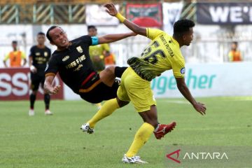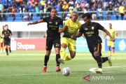 Pesepak bola Barito Putera Amiruddin Bagas Kaffa Arrizqi (kanan) berbenturan dengan Pesepak bola Persis Solo Rian Miziar (kiri) dalam lanjutan BRI Liga 1 di Stadion Demang Lehman, Kabupaten Banjar, Kalimantan Selatan, Selasa (21/3/2023). Barito Putera dikalahkan Persis Solo dengan skor 2-3. ANTARA FOTO/Bayu Pratama S/tom.