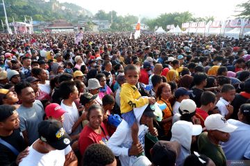 Sejumlah peserta mengikuti acara Jalan Sehat Prabowo di Lapangan Karang PTC Entrop, Kota Jayapura, Papua, Rabu (22/3/2023). Kegiatan yang diikuti ribuan peserta dari berbagai wilayah di Papua tersebut merupakan rangkaian peringatan HUT Partai Gerindra ke-15 di Papua. ANTARA FOTO/Sakti Karuru/pras.