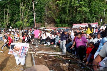Sejumlah peserta melewati pagar yang roboh saat mengikuti acara Jalan Sehat Prabowo di Lapangan Karang PTC Entrop, Kota Jayapura, Papua, Rabu (22/3/2023). Kegiatan yang diikuti ribuan peserta dari berbagai wilayah di Papua tersebut merupakan rangkaian peringatan HUT Partai Gerindra ke-15 di Papua. ANTARA FOTO/Sakti Karuru/pras.