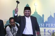 Menteri Agama Yaqut Cholil Quomas mengetuk palu usai memberikan keterangan pers penetapan 1 Ramadhan 1444 H di kantor Kementerian Agama, Jakarta, Rabu (22/3/2023). Pemerintah memutuskan 1 Ramadhan 1444 H jatuh pada Kamis (23/3). ANTARA FOTO/Rivan Awal Lingga/aww.
