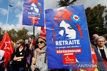Pengunjuk rasamembawa spanduk dan poster saat unjiuk rasa hari kesembilan pemogokan nasional dan protes terhadap reformasi pensiun Pemerintah Prancis, di Nantes, Prancis (23/3/2023). ANTARA FOTO/REUTERS/Stephane Mahe/tom.