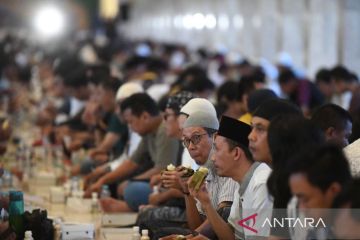 Umat Islam berbuka puasa bersama di Masjid Istiqlal, Jakarta, Kamis (23/3/2023). Masjid Istiqlal menyediakan 2.000 menu berbuka puasa pada Senin hingga Kamis, dan 3.000 menu pada Jumat, Sabtu, dan Minggu selama bulan Ramadhan. ANTARA FOTO/Akbar Nugroho Gumay/tom.