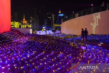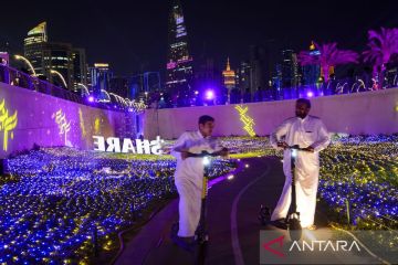 Pengunjung melihat jalan yang dihiasi dengan lampu pada Festival Lampu Ramadhan Doha 2023 di Doha Corniche, Doha, Qatar (24/3/ 2023). ANTARA FOTO/NurPhoto-Noushad Thekkayil via Reuters/tom.