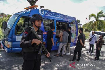 Petugas kepolisian berjaga saat warga menukarkan uang tunai baru di layanan mobil kas keliling Kantor Perwakilan (KPw) Bank Indonesia Kalteng di halaman Kantor Pemprov Kalteng, Palangka Raya, Kalimantan Tengah, Rabu (29/3/2023). KPw Bank Indonesia Kalimantan Tengah bekerja sama dengan perbankan setempat menyediakan layanan penukaran uang di 47 titik yang tersebar di seluruh wilayah provinsi itu dengan menyediakan uang tunai sebesar Rp2,6 triliun untuk memenuhi kebutuhan masyarakat mendapatkan uang tunai baru saat Ramadhan dan Lebaran. ANTARA FOTO/Makna Zaezar/aww.