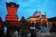 Sejumlah umat Islam berjalan di depan Masjid Menara Kudus atau bernama resmi Masjid Al Aqsa Manarat Qudus di Desa Kauman, Kudus, Jawa Tengah, Jumat (31/3/2023). Masjid bersejarah yang dibangun pada masa Sunan Kudus atau Syekh Ja'far Shodiq pada tahun 956 H atau1549 M itu memiliki arsitektur perpaduan budaya Islam dengan budaya Hindu-Jawa dan ramai untuk kegiatan keagamaan selama bulan Ramadhan. ANTARA FOTO/Yusuf Nugroho/nym.