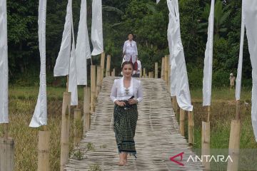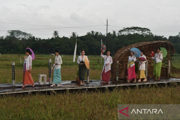 Sejumlah anggota komunitas perempuan pelestari budaya memperagakan busana kebaya dan kain tenun Baduy di Angkringan Tepi Sawah, Setu, Kabupaten Bekasi, Jawa Barat, Minggu (2/4/2023). Pagelaran busana tersebut diadakan untuk mempromosikan wisata dan melestarikan pakaian adat tradisional Indonesia. ANTARA FOTO/Fakhri Hermansyah/nym.