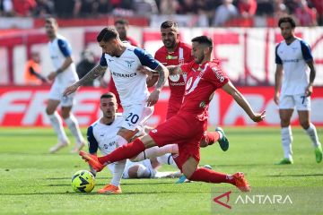 Pemain Lazio Pedro berselebrasi setelah berhasil membobol gawang Monza dalam pertandingan sepak bola lanjutan Liga Italia di Stadio Brianteo, Monza, Italia, Minggu (2/4/2023). Lazio berhasil memenangkan pertandingan dengan skor 2-0. ANTARA FOTO/Reuters/Massimo Pinca/nym.