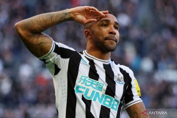 Pesepak bola Newcastle United Callum Wilson melakukan selebrasi setelah mencetak gol ke gawang Manchester United dalam laga lanjutan Liga Inggris, di Stadion St James' Park, Newcastle, Inggris, Minggu (2/4/20230. Newcastle United berhasil mengalahkan Manchester United 2-0. ANTARA FOTO/Reuters-Lee Smith/hp.