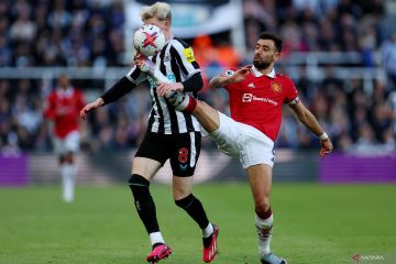 Pesepak bola Newcastle United Anthony Gordon (kiri) berebut bola dengan pesepak bola Manchester United Bruno Fernandes (kanan) dalam laga lanjutan Liga Inggris, di Stadion St James' Park, Newcastle, Inggris, Minggu (2/4/20230. Newcastle United berhasil mengalahkan Manchester United 2-0. ANTARA FOTO/Reuters-Lee Smith/hp.