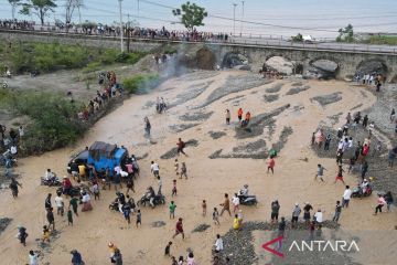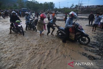 Pengendara melintasi sungai akibat jembatan ambles dan tidak dapat dilalui di Kelurahan Buluri di Palu, Sulawesi Tengah, Jumat (7/4/2023). Jembatan jalur penghubung Kota Palu dan Donggala hingga ke Sulawesi Barat serta Sulawesi Selatan yang menjadi salah satu jalur utama bagi pemudik tersebut terputus sehingga pengguna jalan terpaksa melintasi sungai. ANTARA FOTO/Mohamad Hamzah/tom.