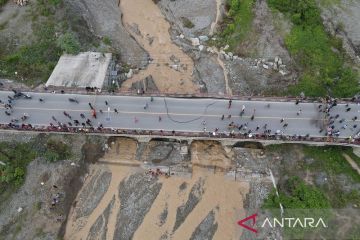 Foto udara kondisi jembatan yang ambles akibat hujan di Kelurahan Buluri di Palu, Sulawesi Tengah, Jumat (7/4/2023). Jembatan jalur penghubung Kota Palu dan Donggala hingga ke Sulawesi Barat serta Sulawesi Selatan yang menjadi salah satu jalur utama bagi pemudik tersebut terputus sehingga pengguna jalan terpaksa melintasi sungai. ANTARA FOTO/Mohamad Hamzah/tom.