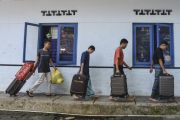 Sejumlah santri membawa koper di Pondok Pesantren Darussalam, Kabupaten Ciamis, Jawa Barat, Selasa (11/4/2023). Sebanyak 1.400 orang santri dari berbagai daerah mudik lebih awal pada masa liburan Hari Raya Idul Fitri 1444 Hijriah. ANTARA FOTO/Adeng Bustomi/hp.
