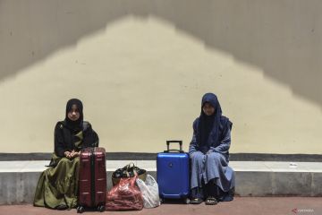 Santri menunggu jemputan di Pondok Pesantren Darussalam, Kabupaten Ciamis, Jawa Barat, Selasa (11/4/2023). Sebanyak 1.400 orang santri dari berbagai daerah mudik lebih awal pada masa liburan Hari Raya Idul Fitri 1444 Hijriah. ANTARA FOTO/Adeng Bustomi/hp.