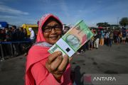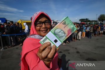Warga menunjukkan uang pecahan hasil penukaran di Posko Penukaran Uang Bank Indonesia (BI) di area 'Rest Area' KM 57 Tol Jakarta-Cikampek, Karawang, Jawa Barat, Minggu (16/4/2023). Bank Indonesia menyediakan sekitar Rp2 miliar setiap hari di lokasi tersebut untuk melayani pemudik Lebaran 2023 dan masyarakat setempat yang telah mendaftar secara daring dengan batasan maksimal menukarkan satu paket pecahan uang sebesar Rp3,8 juta per orang. ANTARA FOTO/Aditya Pradana Putra/rwa.
