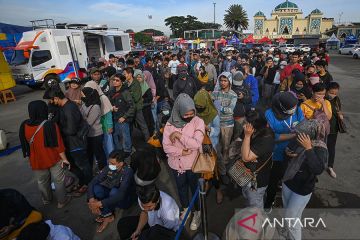 Sejumlah warga mengantre untuk menukarkan uang di Posko Penukaran Uang Bank Indonesia (BI) di area 'Rest Area' KM 57 Tol Jakarta-Cikampek, Karawang, Jawa Barat, Minggu (16/4/2023). Bank Indonesia menyediakan sekitar Rp2 miliar setiap hari di lokasi tersebut untuk melayani pemudik Lebaran 2023 dan masyarakat setempat yang telah mendaftar secara daring dengan batasan maksimal menukarkan satu paket pecahan uang sebesar Rp3,8 juta per orang. ANTARA FOTO/Aditya Pradana Putra/rwa.