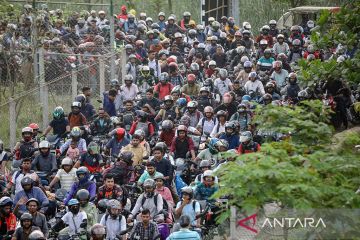 Pemudik bersepeda motor terjebak kemacetan di area tol jembatan Padma di Munshiganj, Bangladesh, Kamis (20/4/2023). Pemudik ramai keluar dari kota Dhaka untuk merayakan Idul Fitri di kampung halamannya bersama keluarga. ANTARA FOTO/Reuters/Mohammad Ponir Hossain/nym.
