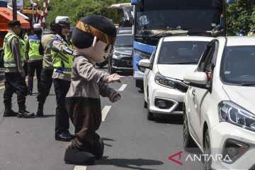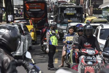 Polisi mengatur arus lalu lintas di Pamoyanan, Kabupaten Tasikmalaya, Jawa Barat, Selasa (25/4/2023). Arus balik H+3 Lebaran, Polres Tasikmalaya Kota memberlakukan sistem satu arah dari Pos Pengamanan Simpang Panyusuhan menuju Garut untuk mengurai kepadatan dan kemacetan pemudik. ANTARA FOTO/Adeng Bustomi/aww.