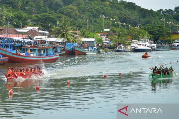 Tim Dayung TTSA (atas) adu cepat dengan tim PDP (bawah) saat lomba Selaju Sampan di Sungai Batang Arau, Padang, Sumatera Barat, Rabu (26/4/2023). Lomba Selaju Sampan kembali digelar dalam rangka melestarikan tradisi olahraga air di sungai bersejarah itu sekaligus untuk hiburan bagi warga dan perantau di masa libur Lebaran. ANTARA FOTO/Iggoy el Fitra/tom.