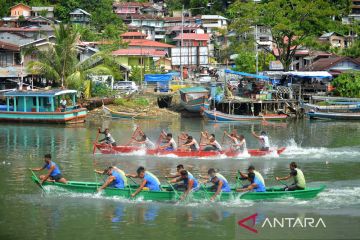 Tim Dayung Benteng Sepakat (bawah) adu cepat dengan tim IPPKBM saat lomba Selaju Sampan di Sungai Batang Arau, Padang, Sumatera Barat, Rabu (26/4/2023). Lomba Selaju Sampan kembali digelar dalam rangka melestarikan tradisi olahraga air di sungai bersejarah itu sekaligus untuk hiburan bagi warga dan perantau di masa libur Lebaran. ANTARA FOTO/Iggoy el Fitra/tom.