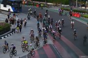 Warga dan sejumlah kendaraan bermotor melintas di Jalan Jenderal Sudirman, Jakarta, Minggu (30/4/2023). Meski Pemprov DKI Jakarta masih meniadakan hari bebas kendaraan bermotor (CFD) di Ibu Kota pada 30 April 2023 karena momen Lebaran 2023, namun sejumlah warga terpantau masih beraktivitas dan berolahraga di ruas Jalan MH Thamrin dan Jalan Jenderal Sudirman, Jakarta. ANTARA FOTO/Sigid Kurniawan/foc.
