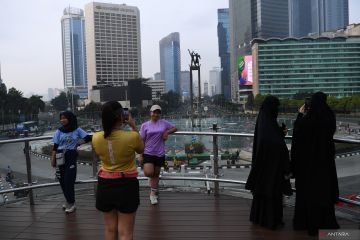 Warga berfoto berlatar belakang Bundaran HI di Jakarta, Minggu (30/4/2023). Meski Pemprov DKI Jakarta masih meniadakan hari bebas kendaraan bermotor (CFD) di Ibu Kota pada 30 April 2023 karena momen Lebaran 2023, namun sejumlah warga terpantau masih beraktivitas dan berolahraga di ruas Jalan MH Thamrin dan Jalan Jenderal Sudirman, Jakarta. ANTARA FOTO/Sigid Kurniawan/foc.