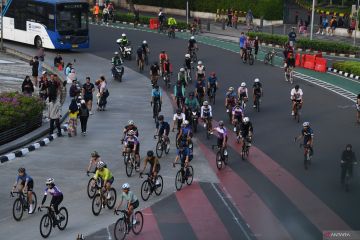 Warga dan sejumlah kendaraan bermotor melintas di Bundaran HI, Jakarta, Minggu (30/4/2023). Meski Pemprov DKI Jakarta masih meniadakan hari bebas kendaraan bermotor (CFD) di Ibu Kota pada 30 April 2023 karena momen Lebaran 2023, namun sejumlah warga terpantau masih beraktivitas dan berolahraga di ruas Jalan MH Thamrin dan Jalan Jenderal Sudirman, Jakarta. ANTARA FOTO/Sigid Kurniawan/foc.