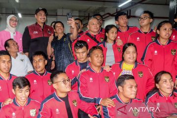 Menpora Ario Bimo Nandito Ariotedjo (kedua kiri) berfoto bersama atlet Pelatnas ASEAN Para Games Kamboja 2023 di Solo Baru, Kabupaten Sukoharjo, Jawa Tengah, Senin (8/5/2023). Tim NPC Indonesia menargetkan juara umum pada ajang ASEAN Para Games Kamboja 2023 yang akan berlangsung pada 3-9 Juni 2023 di Phnom Penh, Kamboja. ANTARAFOTO/Maulana Surya/aww.