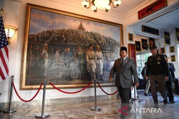 Menteri Pertahanan Prabowo Subianto (kiri) bersama Kepala Staf Angkatan Darat Amerika Serikat Jenderal James C Mc Conville berjalan usai memberikan penghormatan kepada patung Bung Karno Berkuda di Kantor Kementerian Pertahanan, Jakarta, Jumat (12/5/2023). Menhan Prabowo Subianto dan Mc Conville sepakat melanjutkan kerja sama bidang pertukaran personel, taruna, serta latihan bersama antara TNI AD dengan Angkatan Darat Amerika Serikat. ANTARA FOTO/Sigid Kurniawan/tom.