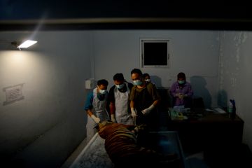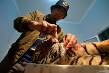 Harimau Sumatera mati akibat jerat babi. Dokter hewan melakukan nekropsi tubuh Harimau Sumatera (Panthera tigris sumatrae) di UPTD Rumah Sakit Hewan Sumatera Barat, di Padang, Selasa (16/5/2023). Seekor Harimau Sumatera diperkirakan berusia dua tahun itu mati usai terkena jerat babi di Jorong Tikalak, Tanjung Beringin, Pasaman, pada Selasa (16/5/2023) dan dibawa ke Padang untuk dilakukan nekropsi (pembedahan) sekaligus penguburan. ANTARA FOTO/Iggoy el Fitra/rwa.ANTARA FOTO/Iggoy el Fitra (ANTARA FOTO/Iggoy el Fitra)