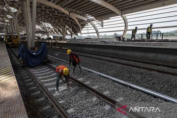Pekerja menyelesaikan proyek pembangunan Stasiun Kereta Cepat Jakarta-Bandung (KCJB) Halim di Jakarta Timur, Rabu (17/5/2023). PT Kereta Cepat Indonesia China (KCIC) mencatat hingga saat ini pengerjaan stasiun awal di lintasan kereta cepat Jakarta Bandung (KCJB) tersebut mencapai 91 persen dan ditargetkan akan diresmikan oleh Presiden Joko Widodo pada 18 Agustus 2023. ANTARA FOTO/Aprillio Akbar/rwa.