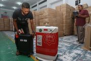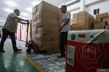 Pekerja menyiapkan koper Jemaah calon haji sebelum didistribusikan di Kantor Pos Cabang Utama Banda Aceh, Aceh, Kamis (18/5/2023). Kantor Wilayah Kementerian Agama Provinsi Aceh mulai mendistribusikan koper dan kebutuhan logistik lain bagi 4.378 Jemaah calon haji tahun 2023 sebagai persiapan keberangkatan haji yang akan dimulai dengan kelompok terbang pertama pada 24 Mei mendatang. ANTARA FOTO/Khalis Surry/foc.
