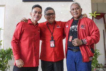 Sekjen PDI Perjuangan Hasto Kristiyanto (tengah) bersama Wali Kota Solo Gibran Rakabuming Raka (kiri) dan Ketua Bidang Kehormatan PDI Perjuangan Komarudin Watubun (kanan) berpelukan usai mengelar pertemuan tertutup di Kantor DPP PDI Perjuangan, Jakarta, Senin (22/5/2023). Kedatangan Gibran Rakabuming Raka tersebut untuk memenuhi panggilan DPP PDI Perjuangan guna mengklarifikasi terkait dengan deklarasi yang dilakukan relawan Jokowi-Gibran yang mendukung bakal calon presiden dari Partai Gerindra Prabowo Subianto pada Jumat (19/5/2023) malam di Solo. ANTARA FOTO/Galih Pradipta/foc.