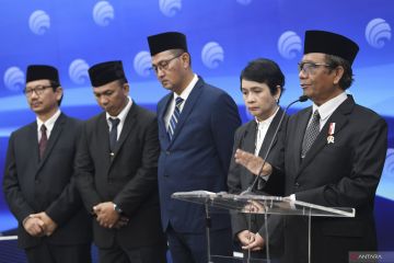 Plt Menkominfo Mahfud MD (kanan) didampingi Sekjen Kominfo Mira Tayyiba (kedua kanan), Dirjen Aplikasi Informatika Semuel Abrijani Pangerapan (ketiga kanan) dan pimpinan tinggi madya memberikan keterangan kepada wartawan di Kantor Kemenkominfo, Jakarta, Selasa (23/5/2023). Mahfud MD melantik empat pejabat eselon I sebagai pimpinan tinggi madya di lingkungan Kemenkominfo. ANTARA FOTO/M Risyal Hidayat/hp.