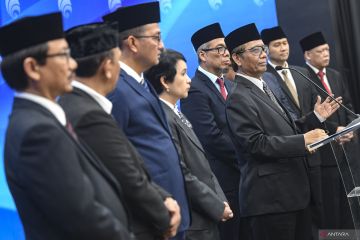 Plt Menkominfo Mahfud MD (ketiga kanan) didampingi Sekjen Kominfo Mira Tayyiba (keempat kiri) dan Direktur Jenderal Informasi dan Komunikasi Publik Kemenkominfo Usman Kansong (keempat kanan) dan jajaran pimpinan tinggi madya memberikan keterangan kepada wartawan di Kantor Kemenkominfo, Jakarta, Selasa (23/5/2023). Mahfud MD melantik empat pejabat eselon I sebagai pimpinan tinggi madya di lingkungan Kemenkominfo. ANTARA FOTO/M Risyal Hidayat/hp.