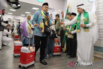 Petugas menyambut jamaah calon haji kloter pertama JKG 01 setibanya di Bandara Amir Muhammad bin Abdul Aziz (AMAA) Madinah, Arab Saudi, Rabu (24/5/2023). Sebanyak 390 calon haji dan empat petugas kloter tiba di Madinah untuk melaksanakan prosesi ibadah haji dengan memanfaatkan layanan cepat keimigrasian di bandara oleh pemerintah Arab Saudi. ANTARA FOTO/HO/Media Center Haji 2023/tom.
