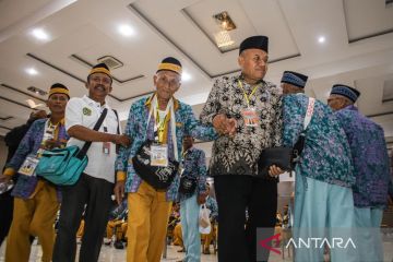 Calon haji Harun bin Senar (tengah) dibantu petugas memasuki Asrama Haji Embarkasi Surabaya (AHES), Surabaya, Jawa Timur, Rabu (24/5/2023). Harun bin Senar asal Kecamatan Proppo, Pamekasan, Madura tersebut menjadi calon haji tertua di Indonesia dengan umur 119 tahun yang akan berangkat ke Tanah Suci tahun 2023. ANTARA FOTO/Rizal Hanafi/tom.