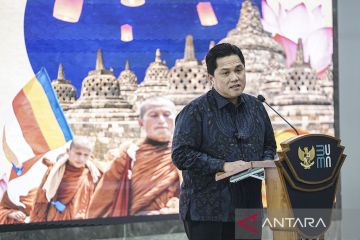 Menteri BUMN Erick Thohir menyampaikan kata sambutan pada media briefing Festival Purnama di Kementerian BUMN, Jakarta, Kamis (25/5/2023). Festival Purnama yang akan diselenggarakan pada 30 Mei - 4 Juni 2023 di kompleks Candi Borobudur tersebut merupakan rangkaian acara perayaan Tri Suci Waisak 2567 BE tahun 2023. ANTARA FOTO/Dhemas Reviyanto/nym.